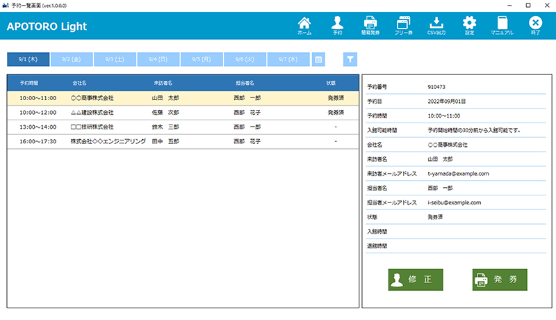 システム運用フロー 画面例 事前予約 -TOP画面- 事前予約 -予約画面- 簡易発券 突然の訪問やアポイントなしの来訪にも対応します。 フリー券発券 事前に複数枚印刷しておき手渡しすることで セミナーや団体客など入館に対応します。 システム構成例 利用イメージ・システム構成について ご不明な点があればお気軽に お問い合わせください。